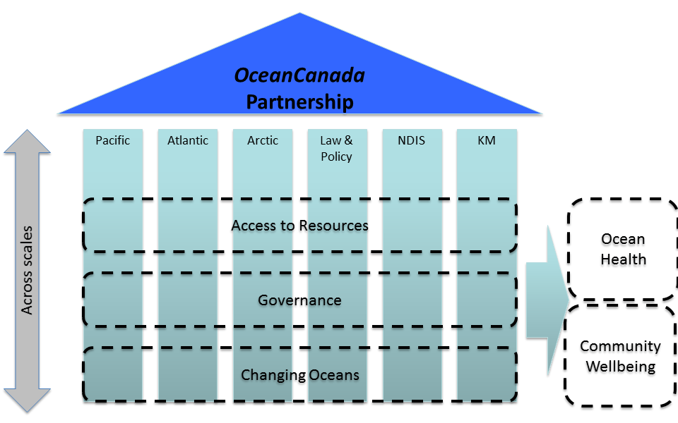 A key objective of the OceanCanada partnership is to integrate knowledge across academics, community stakeholders, and organizations (private and public sectors) and offer a new avenue for data sharing, cross-fertilization of ideas, co-creation of knowledge, and collaborative building of research and governance capacity for the benefit of both current and future generations of Canadians. At our May 2016 conference, OceanCanada members devoted much time to devising plans to integrate the research of our existing Working Groups: Atlantic, Pacific, and Arctic (regional); and National Data and Integrated Scenarios, Law and Policy, and Knowledge Mobilization (national). Three new cross-cutting themes (CCTs) were created at this meeting – Access to Resources, Governance, and Changing Oceans, all in the context of ocean health and community wellbeing. Since our May conference, we have been working hard to advance the work of all groups to provide a more integrated approach to issues related to OceanCanada’s mandate. The integrative and cross-cutting nature of these themes is captured in the OceanCanada Partnership roof. As depicted in this figure, the goal is to conduct research that cuts across scales and Working Groups.